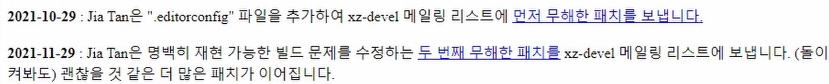 먼저 Jia Tan, 편의상 지아탄이라고 부를 것이다. 지아탄은 공개되어 있는 xz 유틸리티 소스에 2021년 10월과 11월에 두 차례 첫 패치, 두 번째 패치를 보낸다. 이때까진 크게 문제가 없는 정상적인 코드이다.