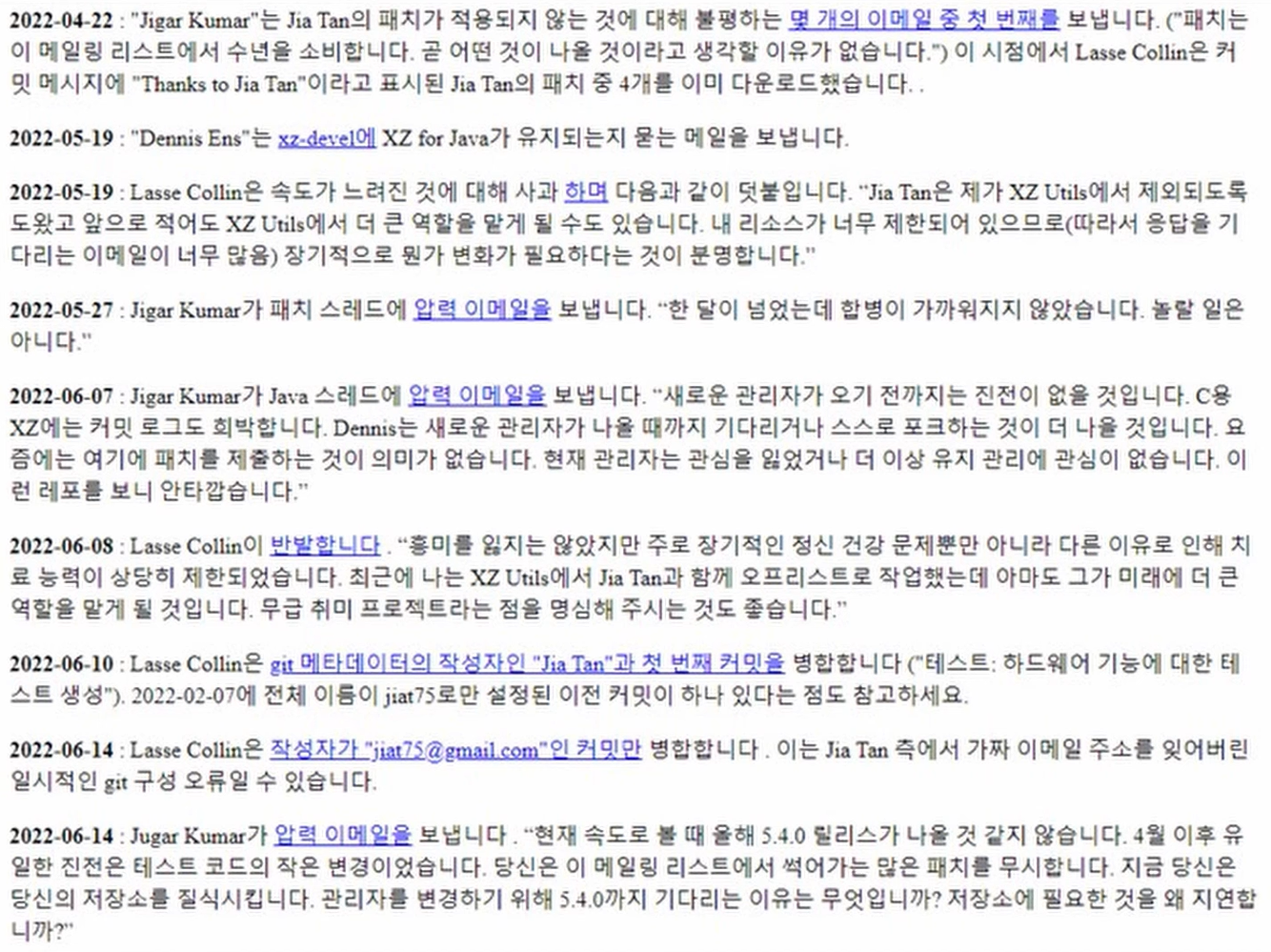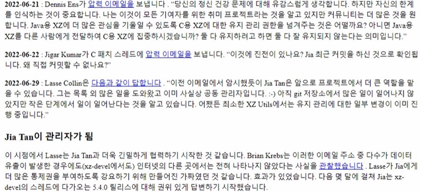 2022년 6월 21일 데니스 앤스는 라쎄 콜린에게 힘들다면 더 많은 것을 원하는 사람들을 위해 xz에 더 많은 관심을 기울일 수 있도록 권한을 다른 사람에게 넘겨주는 게 어떻겠냐?라는 내용의 메일을 보내게 되고 라쎄 콜린은 결국 처음부터 여러 패치판을 제공해 주었던 Jia Tan에게 관리자를 넘겨주게 된다.